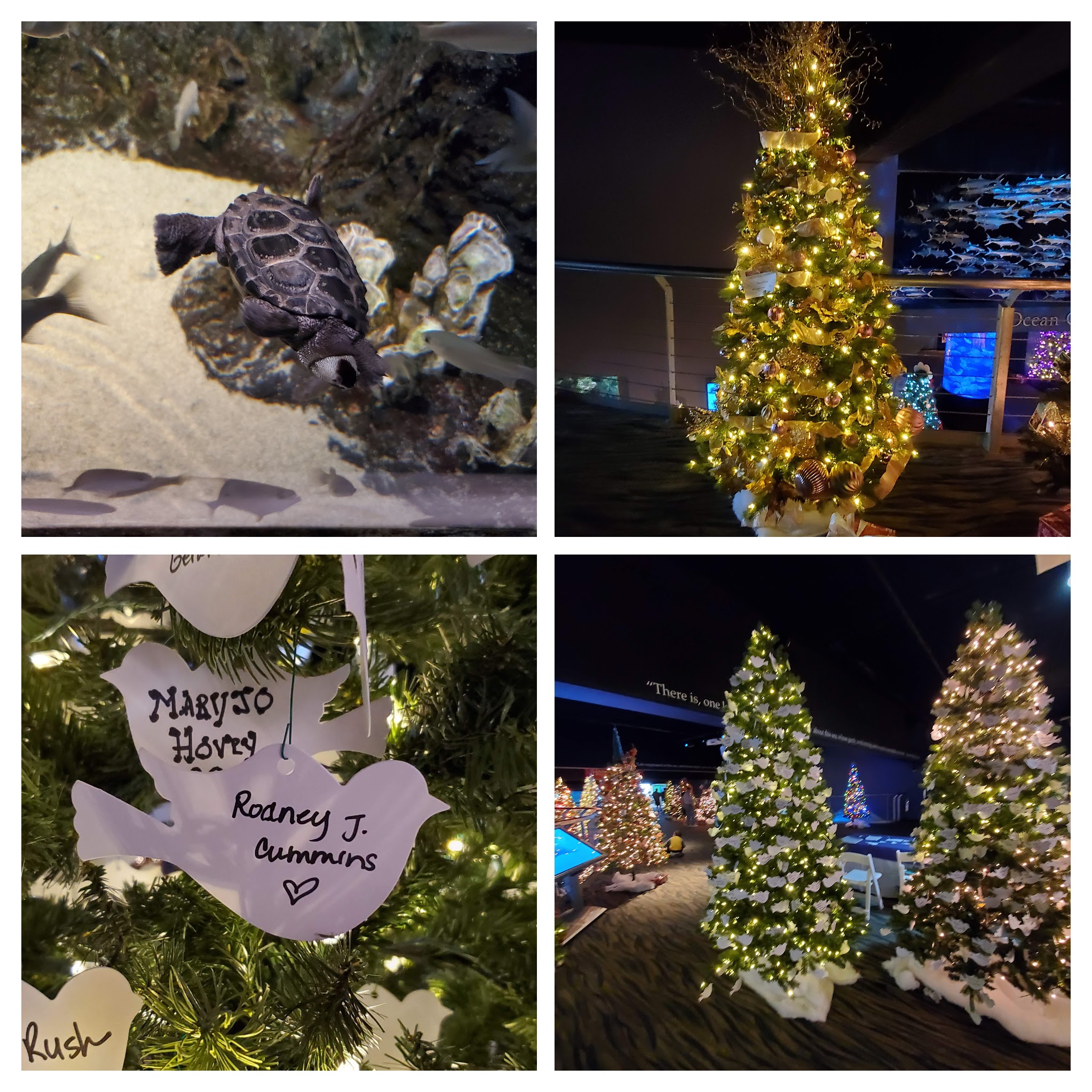 Yesterday Mar and I got up early to catch the east coast sunrise. There were some clouds but they eventually gave way to a beautiful start to the day. It was breezy and then we went back to Dericka to walk Lil (who was moving slow after her beach day), have breakfast, and do work before heading out to the NC State Aquarium in the afternoon. The aquarium is really neat and they had 3 divers doing a live program underwater. We were also there for their daily fish and weekly shark feed which was cool. They also had TONS of decorated Christmas trees on display (gorgeous) which were part of a local benefit plus a tree of hope where we were able to hang an ornament in Rodney’s honor.