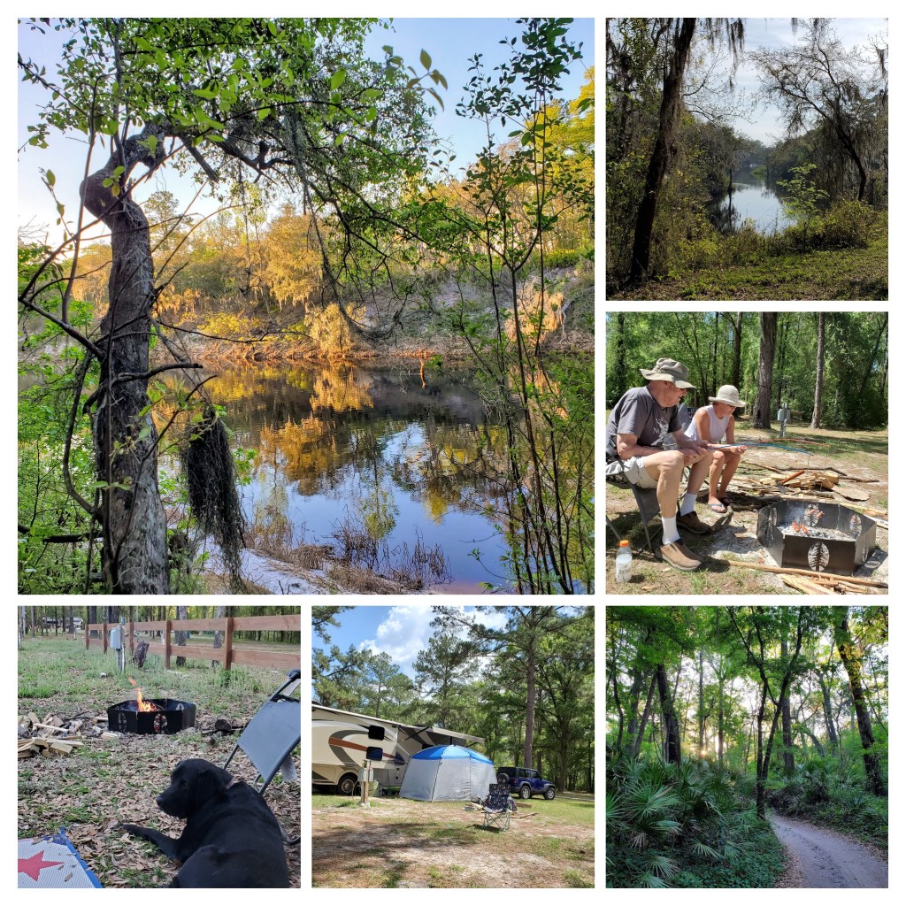 We have talked about it and the three of us have made the decision to stay here as long as they are open. (Or until the shelter at home orders are lifted and life returns to normal) The idea is that we are safer here than on the road, especially since there is no where we need to be. We avoid crossing state lines, having to get gas along interstates, etc. There are currently only 2 cases of COVID in this small county. We can hang here, with all the comforts of home in Dericka, plus we can build a campfire, hike, lay in the hammock, go jeeping, and have the benefit of outdoors with no challenge being socially distant. Temps here have been unseasonably warm- in the upper 80’s-so we are able to spend time in the screen porch (or on the “lanai” as I like to call it) which adds about 70 square feet of space to what we have in the RV. (I’m hoping this will help to keep the walls from closing in.) I am more tan than I have been since college, spending most days outside. There is a Walmart 5 miles away which has been well stocked and we are currently set for at least 10 days of meals. (Not great meals, but food…) The camp store at the park is unbelievably well stocked (milk and RV TP!) and also uncrowded.
